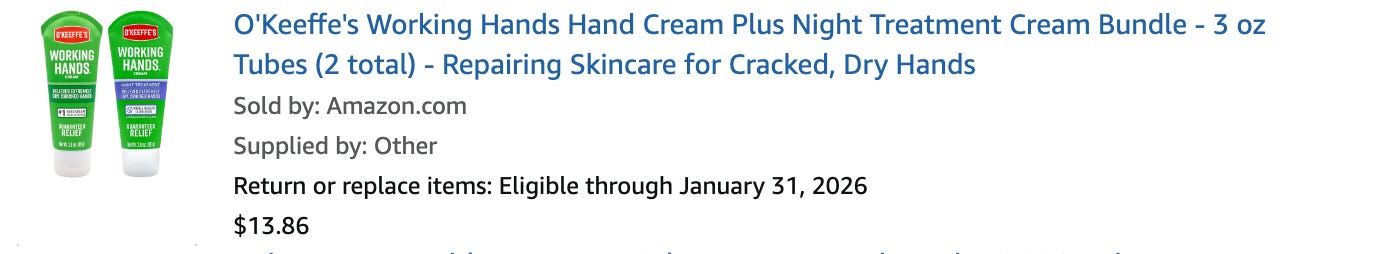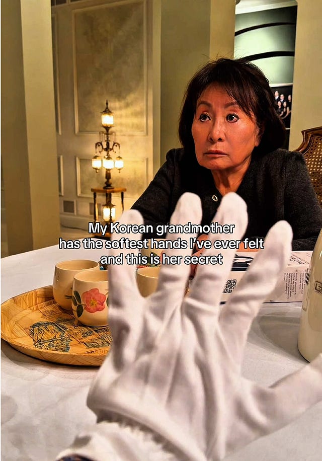 Cotton Gloves for Dry Hands (Sleeping) and Working Hands Cream: Korean grandma-approved! We learned of this magic combo on Christmas. How are your hands so soft, halmoni??? She went straight to her bedroom and emerged with some answers. Success can happen overnight…