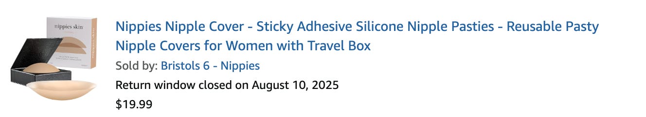 Nippies Covers: Carried us through birthday dinners, holiday parties, and wedding season this year. Could not recommend these enough (have tried others on Amazon; these are truly IT). They stick on nicely and are not too sticky. Also perfect thickness. Really don’t even notice they’re there.