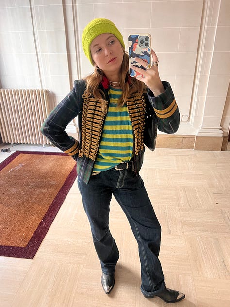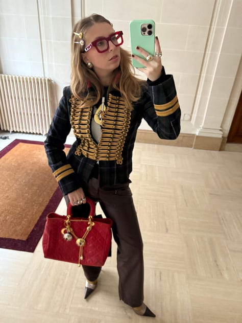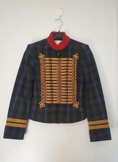 About why I got this jacket specifically: I have always loved the military style jacket, one of my friends when I was a 15 year old teen had one, the most gorgeous Hussard jacket. I really wanted to get the same one but she had gotten it from her mom so I could not find it, but it stuck with me for sure. Always loved this style but never got around to actually buying one. Until I started working at Rabanne a few years ago. I was working specifically on the « passementerie » designs for napoleon style jackets! So after two months of spending my days making them my love for the style was back and I started looking around on Vinted and Vestiaire collective. What is funny is that I was more interested by the circus jacket and fanfare jackets in the beginning, same style if embroidery but less structured, softer fabrics that would drape more. But I came across This piece specifically with the tartan, and anyone who knows me knows that is my fashion staple! I even did a big part of my graduate collection at IFM around tartan. I negotiated and got it for a great price. Honestly to this day it really is one of my greatest vintage finds!