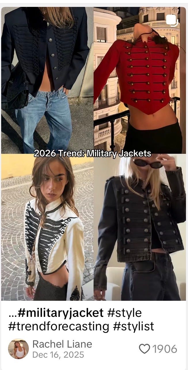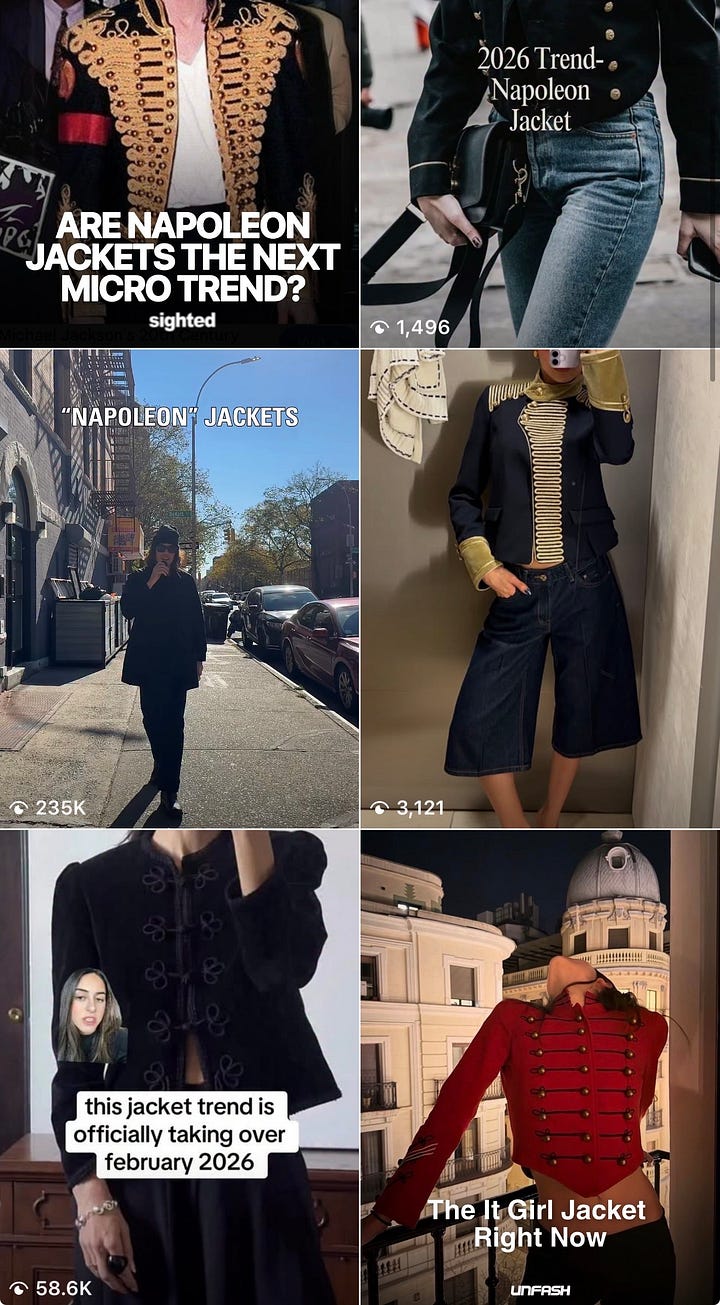 Shy of two years later in late 2025, the Napoleon jacket was suddenly everywhere. We started seeing fashion publications covering it left, right, and center. TikTok creators were heralding it as The Next Thing. Our Substack feeds were saturated. A million Frenchmen couldn’t be wrong: the military coat had officially entered the (coat)room.