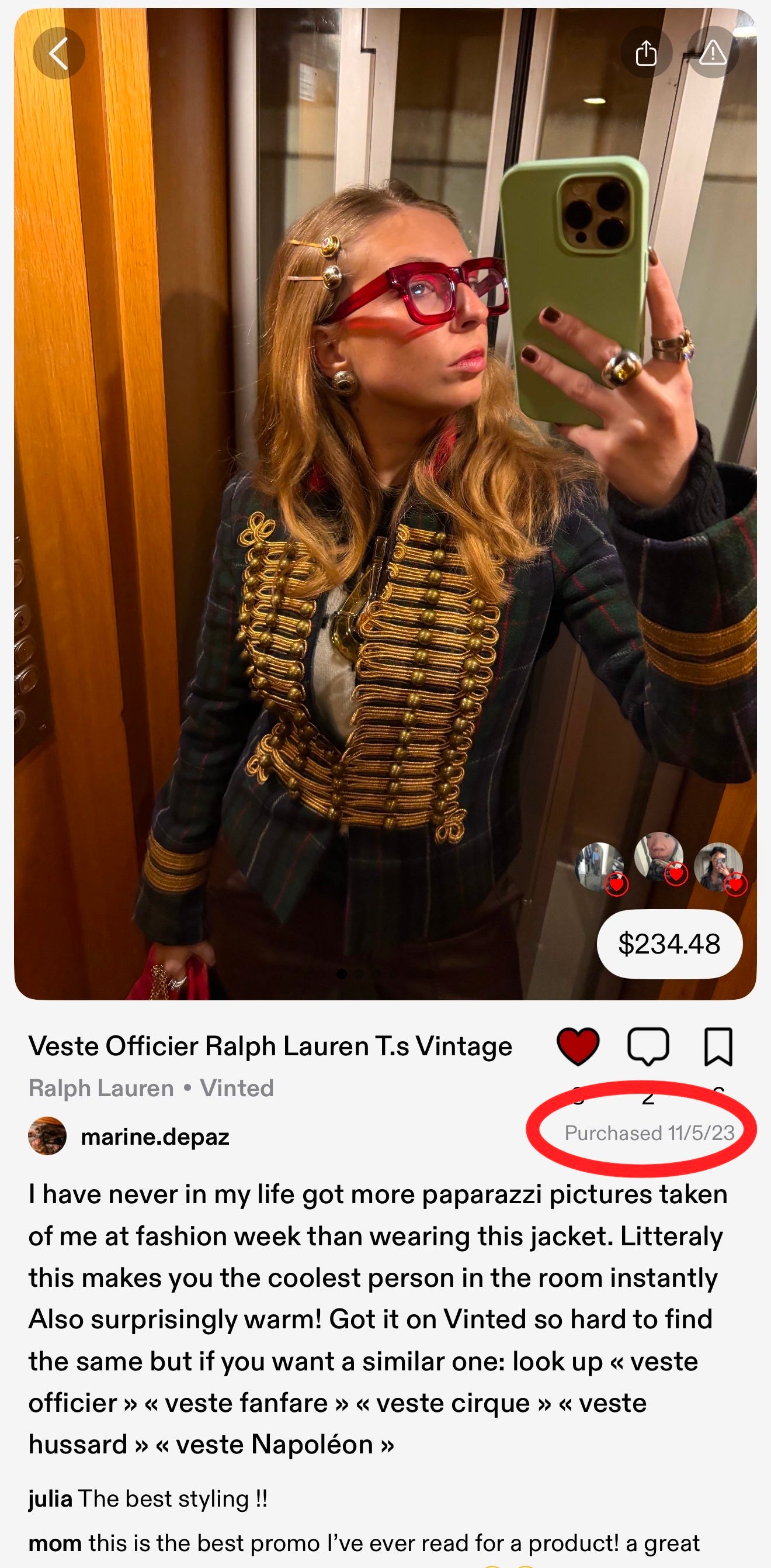 In November 2023, Marine posted a vintage Napoleon-style military jacket she’d hunted down on Vinted. In the caption, she mentioned that the jacket had already made a splash at fashion week, where people couldn’t stop photographing her in it. It was novel and new. It was not, at that point, a trend by any reasonable metric.