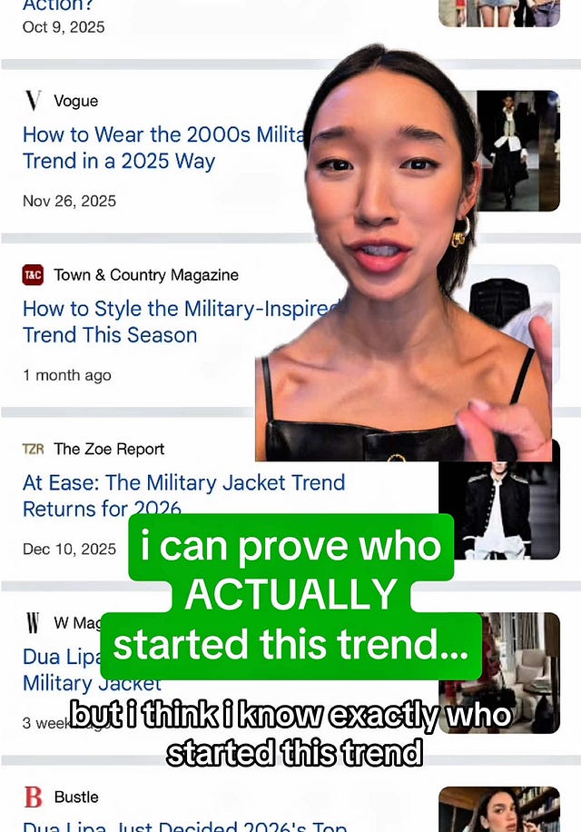 Why? Because 1) Attribution is inconvenient and giving credit takes balls. Admitting a trend started with one woman on Vinted undermines the mythology that trends emerge from the genius of designers and the curatorial eye of editors. 2) Because the patient zero is usually not someone with a PR team. She’s someone with good taste, probably flitting in and out of fashion weeks without much fanfare. 3) Receipts comprise one of the richest datasets of taste, timing, and influence in human history but who the f is reading or keeping track of them anyway?!
