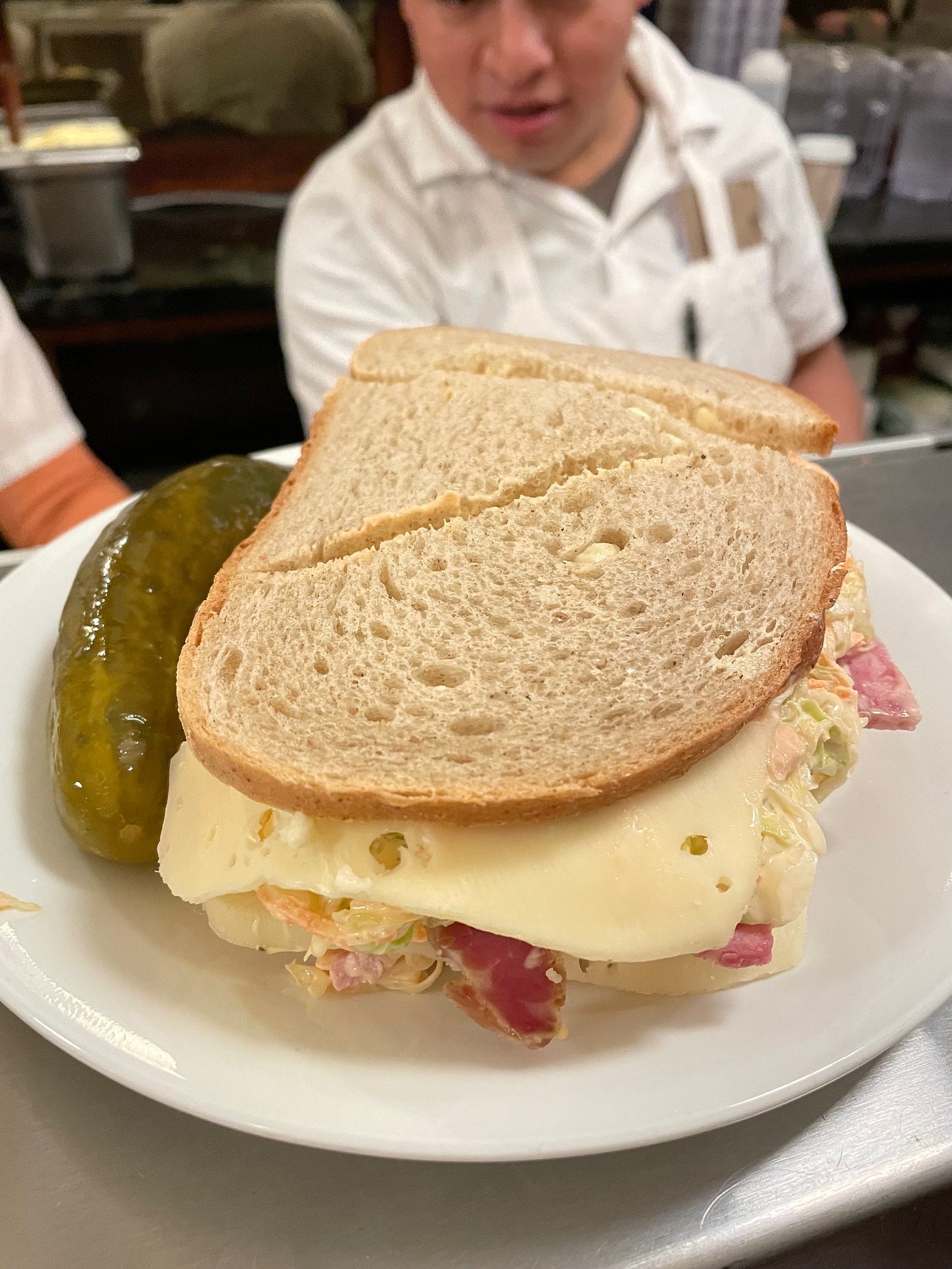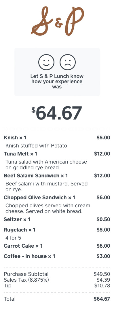 @mattrodbard (writer, founding editor of TASTE, author of Koreatown: A Cookbook, Food IQ, and the newly released Koreaworld: A Cookbook) / Lunch at S&P in NYC: “S&P is legit my favorite between breakfast and lunch spot in NYC - and this order really lived up to my high expectations when I dined there. The chopped olive sandwich is a real crowd pleaser - well for this crowd of one at least. And the coffee is actually good. Note the carrot cake slice at breakfast. Yes, this was our first meal of the day.”