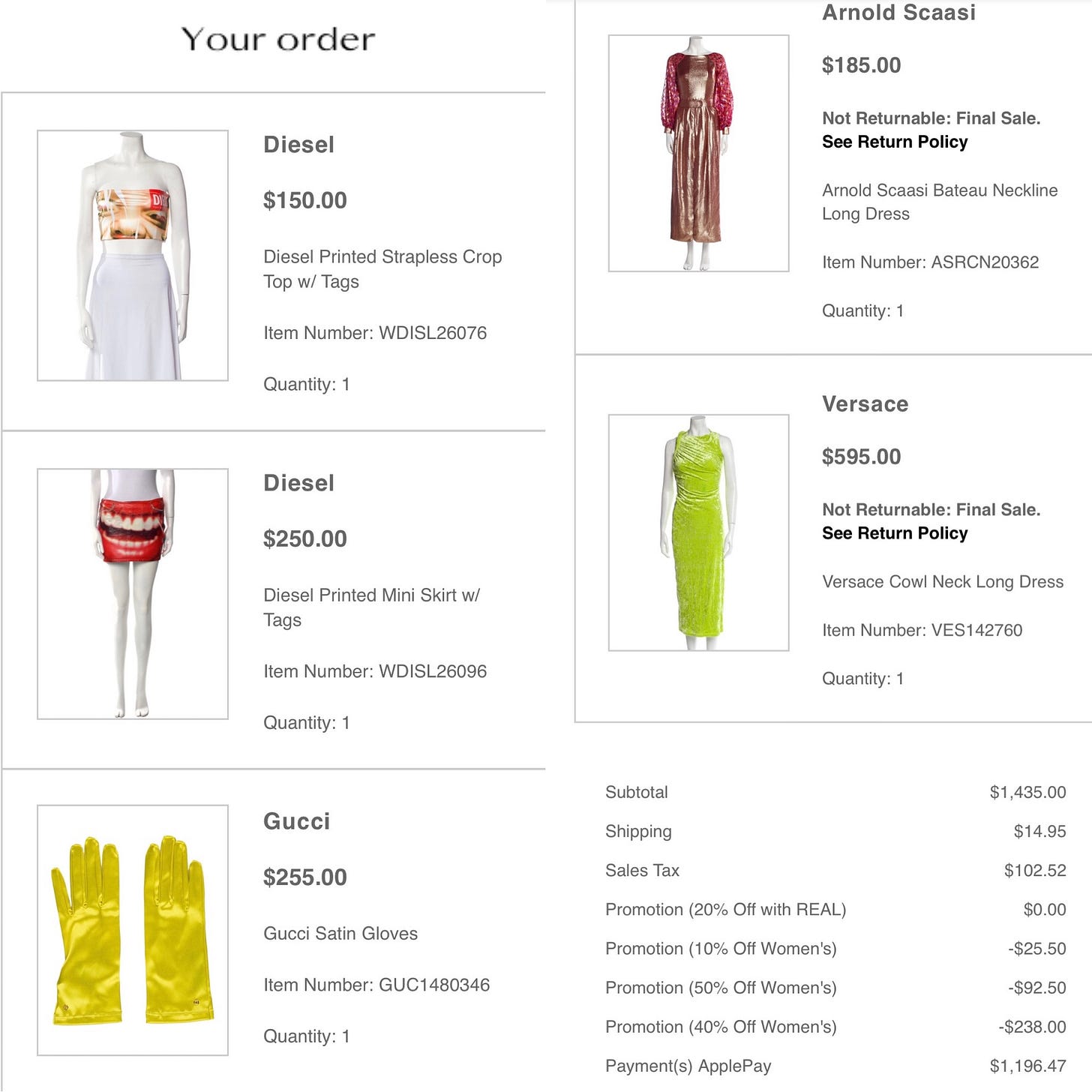 @nicolereber (Vogue calls her “Los Angeles’s Most Colorful Real Estate Agent”) / The RealReal haul (similar Diesel top, Diesel skirt, Gucci gloves, Arnold Scaasi Dress,Versace dress): “I’m going to Paris for a bachelorette and I wanted something that was kind of a combo of Palm Royale / Glenn Martens at Diesels universe. I was excited about the gloves bc I felt like you could wear them with all three outfits.”