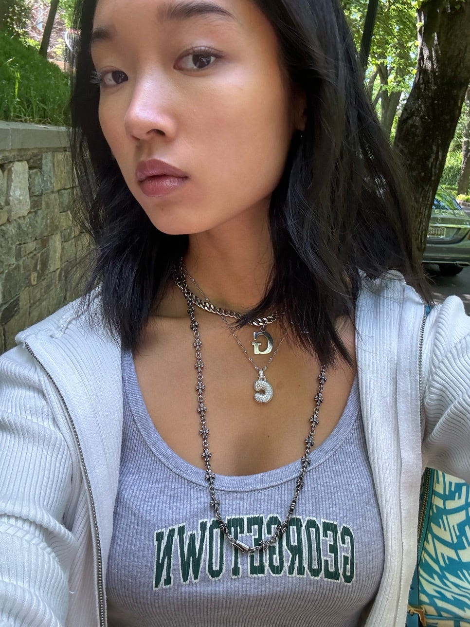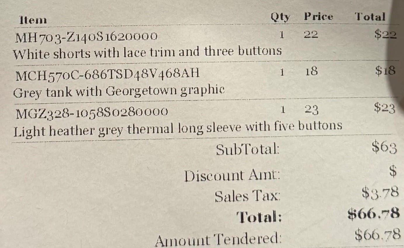 Brandy Melville: Almost wrote Hellville there lol. Georgetown Brandy always has a dependable stash of cute college merch for last-minute planners so had to make a quick pitstop here before the festivities began. You can never have enough school paraphernalia! Also bought a pair of shorts and a top too bc Claire needed some comfy fits cramming for finals….