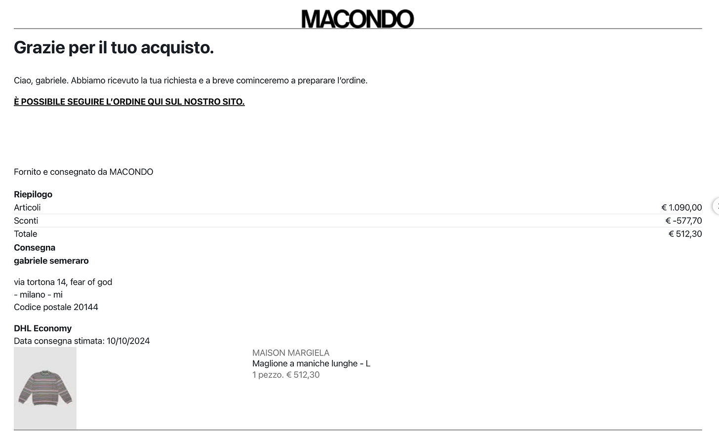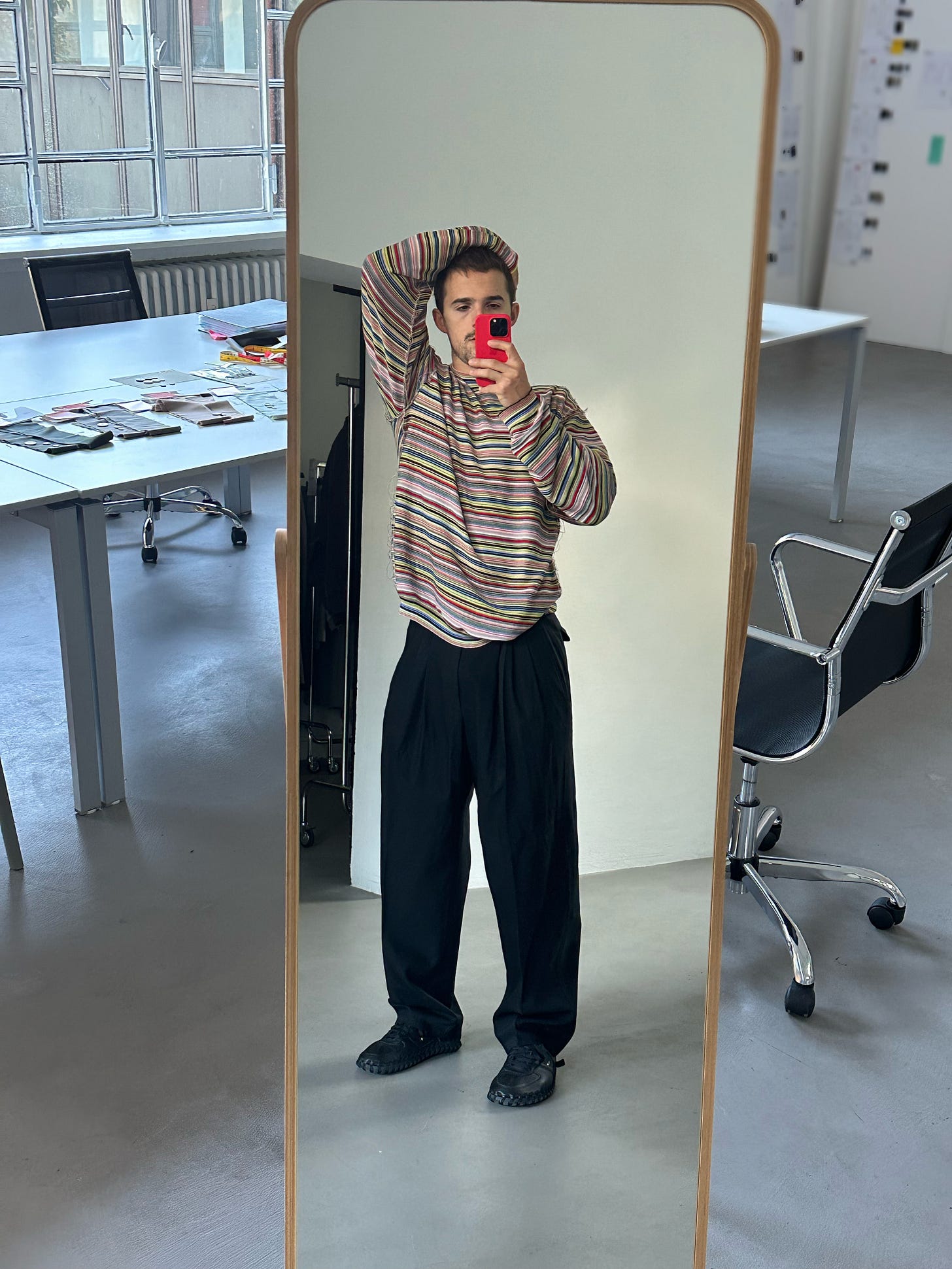 @gabesemeraro (designer — has worked at Versace, Proenza Schouler, Lanvin) / Maison Margiela Striped Cotton Jumper (similar here here and here): “I bought the Margiela sweater because it perfectly represents my constant search for classic pieces with an unexpected twist. I’m drawn to items that, at first glance, seem basic but reveal unique details and construction upon closer inspection. This sweater, with its colorful stripes and apparent simplicity, is the kind of piece I can easily mix and reinterpret, making it my own.”