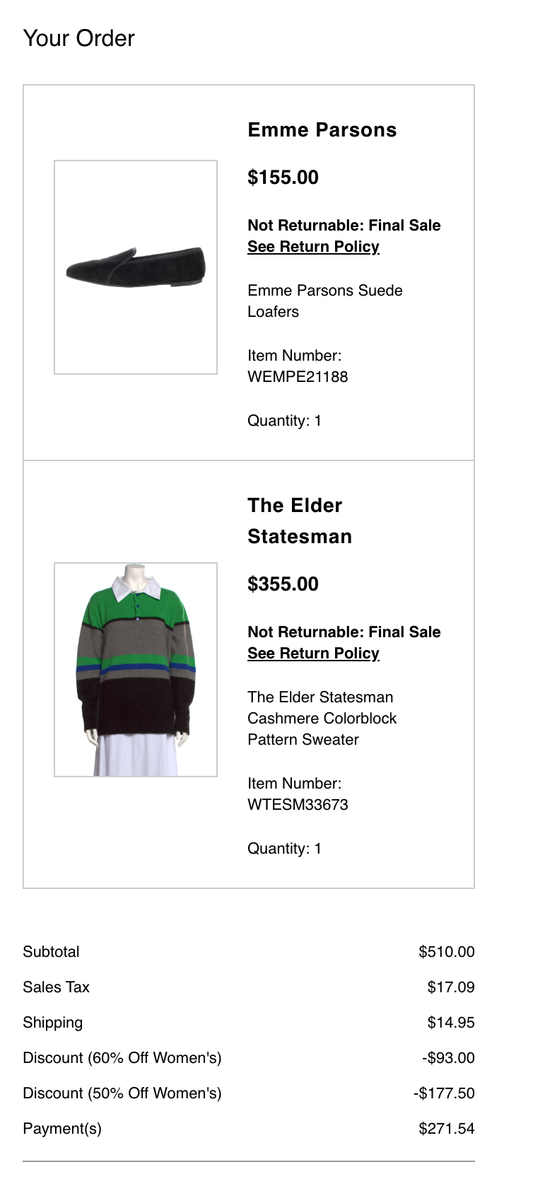 Gatekeeping) / TRR haul (Emme Parsons and The Elder Statesman): “TRR's final sale always makes me nervous, but sometimes you've got to risk it to get the biscuit. I always lust after The Elder Statesman cashmere, and this rugby style is SO ME I could squeal. And it was an extra 50% off, so it was less than $200. I'm only human! The shipping fee is so high that I always try to get more than one thing to justify it, and these Emme Parsons loafers were calling my name too. They retail in the $500 range and were down to $62. (I'm sorry to this seller, who will basically earn enough for a sandwich.) It's just two things, but already I can feel my academia-core fall starting to take shape!”