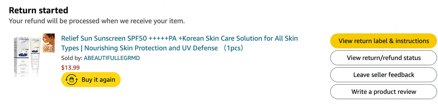 Fake Round Lab Sunscreen (real one HERE lol): Chloe accidentally bought fake sunscreen from Amazon. This is a REMINDER to always fully read product descriptions before buying (bc Amazon sells fake sh*t too). The packaging is SO similar and Round Lab was sold out on Amazon so the fake version was the first listing… Chloe only realized because the texture felt very different and then she re-read the sneaky product listing; the reviews confirmed it was fake and the buyers were breaking out w/ this sunscreen. Return initiated…