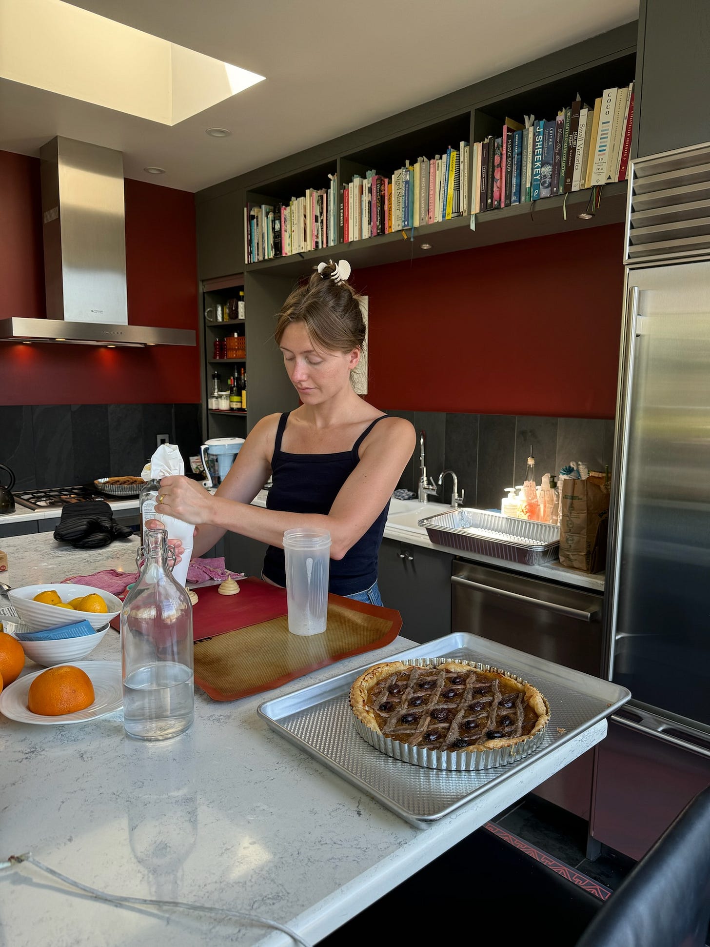 @emmaleighmacdonald (chef (has cooked at Early June, MIMI, St Jardim, LaLou, etc…), editor, writer) / Flore Flore Navy May Camisole (on sale here and here in diff colors): “I work primarily as a chef, on the pop-up series Mon Petit Canard and events that my partner and I run together. Dressing like myself in the kitchen is important, but so is ventilation and machine-wash-ability! A rotation of Flore Flore tanks like this one have been in constant rotation this summer as they work on the line / piping choux but also look chic.”