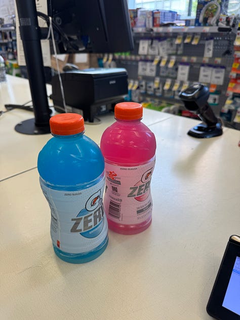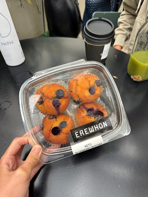 Row 3: Hers & hers Gatorade Zero. Gg. How else are you going to survive a walk from downtown to uptown (and back)? Tried Goodsugar, the Erewhon of NYC? Naur. Twas ok. TikTok Review below. We were in LA last week and ofc paid tribute to the real Erewhon (the keto blueberry muffins are a sleeper smash hit).