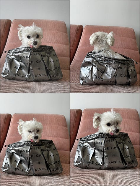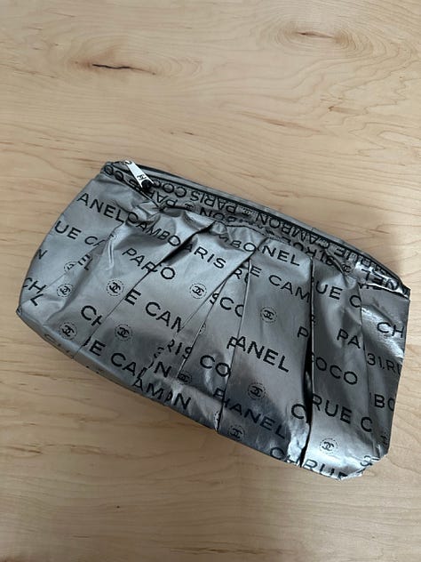 I’m really proud of this vintage early-aughts oversized Chanel CC Rue Cambon clutch I scored from MyTheresa via Vestiaire. I have an aversion to most colors and fashion with words on it, but this reads neutral to me in the same way leopard print does. I punched the air in victory when the seller accepted my low bid (the same bag is selling on Moonstone Vintage for over $1,700).