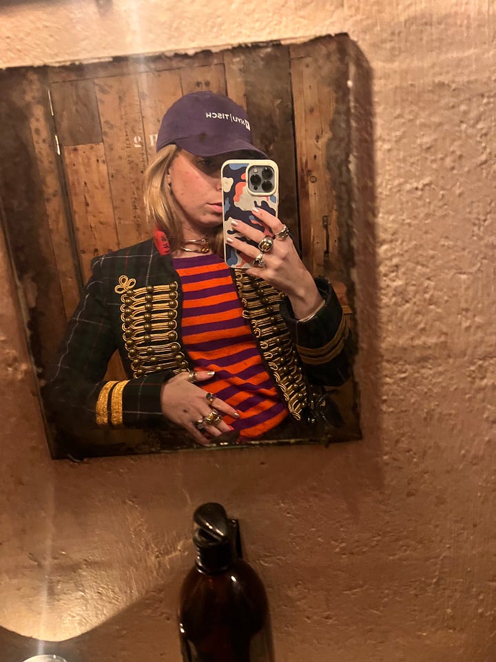 @marinedepaz (founder of Albatroz) / Veste Officier Ralph Lauren T.S Vintage from Vinted (similar here here and here): “I have never in my life got more paparazzi pictures taken of me at fashion week than wearing this jacket. Literally this makes you the coolest person in the room instantly. Also surprisingly warm! Got it on Vinted so hard to find the same but if you want a similar one: look up « veste officier » « veste fanfare » « veste cirque » « veste hussard » « veste Napoléon »”